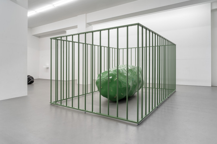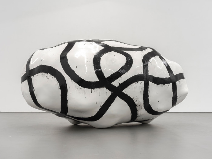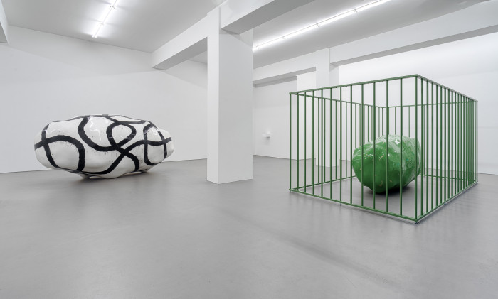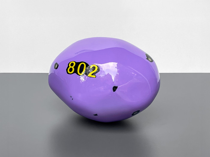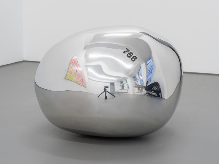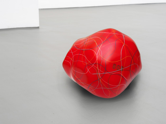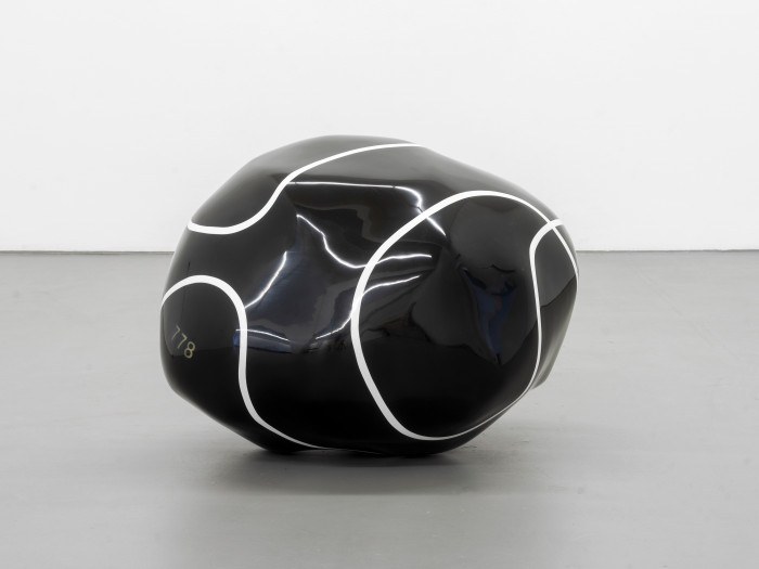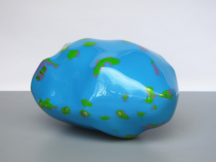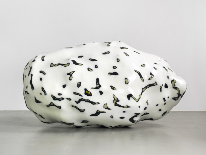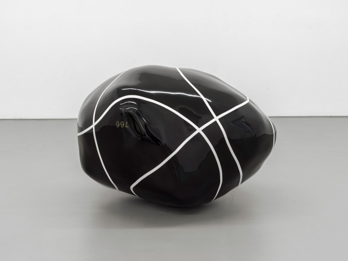 Taking the production residues from his studio as the starting point, Mundt, in a labour-intensive process using the force of his own physique, compresses the matter into lumpy forms weighing up to a ton. In a series of elaborate steps, these material cores are then encased inside a solid shell of glass fibre, coloured synthetic resin, bronze or aluminium. The Trashstones’ formative interiors, the materials as well as their metaphorical content, remain obscured from view by their biomorphic outer form. Each piece is unique and marked with a three-digit sequential number, beginning with 001, to reference their serial production processes.
