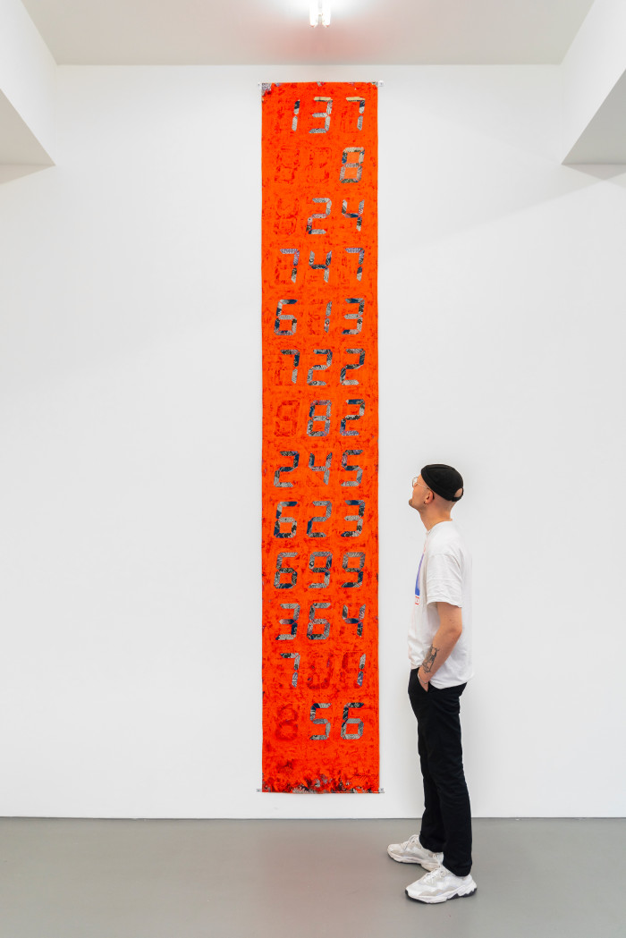 Tatsuo Miyajima Counter Painting on Kimono–Obi - Red, 2013 Acryl auf japanischem Kimono Obi 396,8 x 64,2 cm 156¼ x 25¼ inAnfragen
