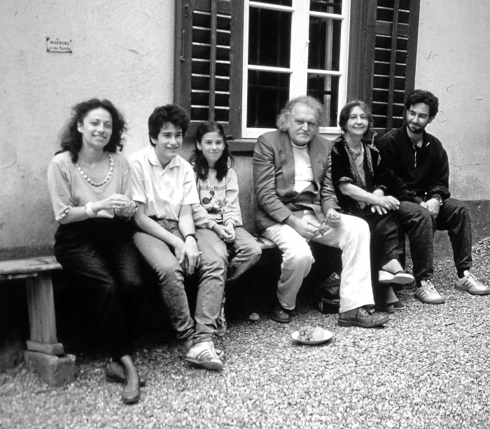 Mario Merz mit Marisa Merz und Elena Buchmann (links) und Felix Buchmann (rechts), Schloss Rietberg, 1983