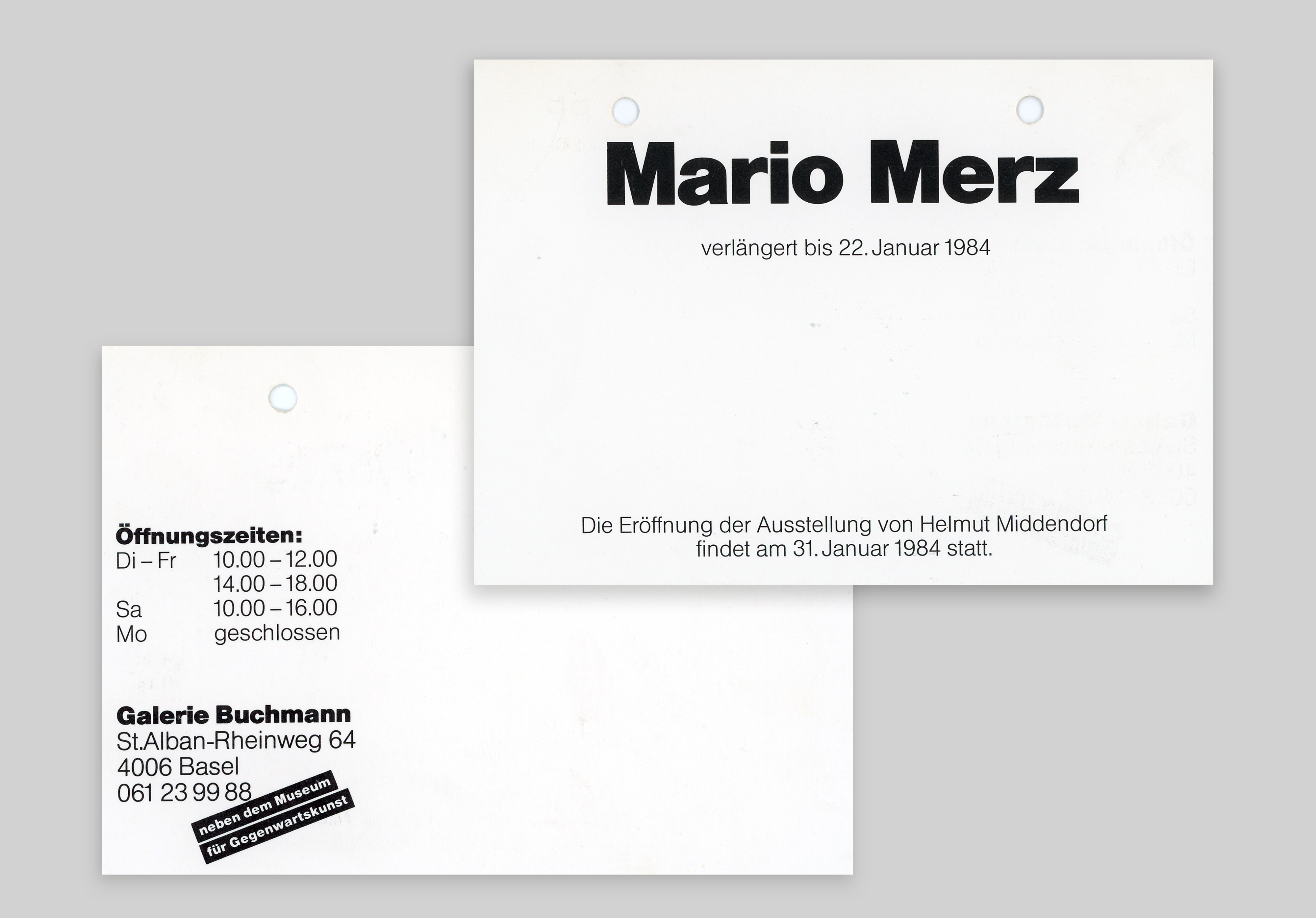 Die auf Rietberg entstandenen Arbeiten installierte Merz in der Galerie in Basel, ergänzt durch Reisigbündel und Neonelemente. Vor Ort entstand auch die Textarbeit mit dem Titel der Ausstellung "ritratto di geco ritratti di rapace gallinaceo e di sfinge che avrebbero dovuto essere fatti 50000 anni prima del 1983". Mario Merz hat den Text handschriftlich mit schwarzer Kohle direkt auf die Wand geschrieben. Diagonal darüber montierte er einen zweiten Text aus blauem Neon: „vento preistorico dalle montagne gelate“. Die Arbeit ist heute in der Sammlung Hubert Looser / Kunsthaus Zürich. Weitere Arbeiten aus dieser Ausstellung sind heute in der Sammlung des Kunstmuseum St.Gallen und in der Sammlung Freybe / Vancouver Art Gallery.