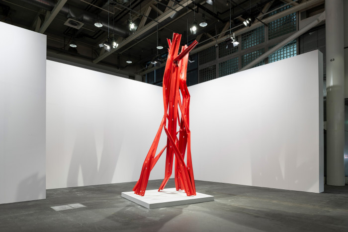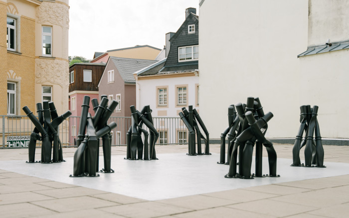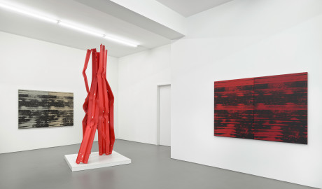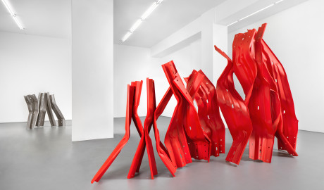 Pousttchi’s sculptural works provide deeper insight into her interest in the structures of public space, often developed from street objects like street bollards, crowd barriers or bike racks. Her recent sculptures Vertical Highways are transformations of guardrails. The vertical alignment and modular use of a prefabricated element change the viewer’s spatial perception and give the work an architectural reference. By applying techniques such as bending or pressing, and reconceiving their coloring, Pousttchi relieves these everyday objects of their regulatory function and detaches them from their context of meaning, turning them into signs of change, fluid structures and dissolving boundaries.